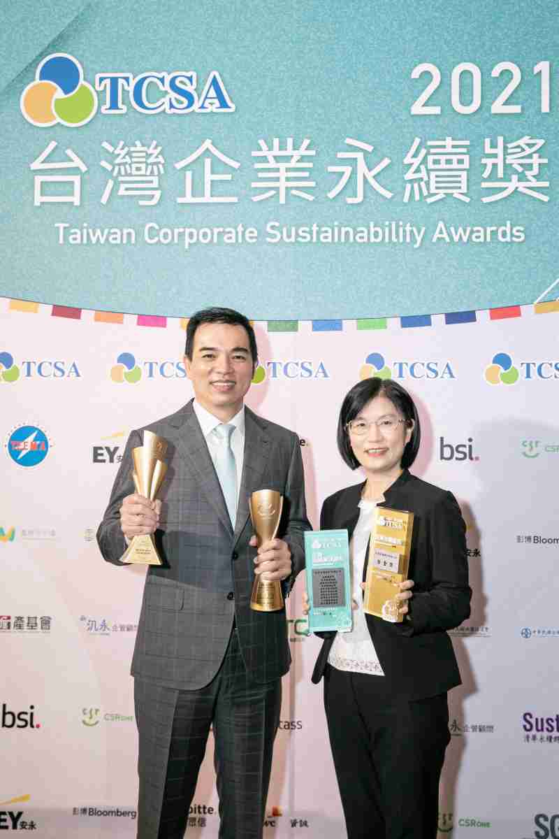 达在台湾永续奖所评比环境、、、、社会、、、、治理等各面向的永续绩效均获高度肯定 (左:尊龙集团光电总经理暨营运长柯富仁,,右:尊龙集团光电永续长古秀华)